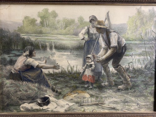 Ancien dessin Georges Laugée couple de paysan et fillette sv Millet Carcassonne